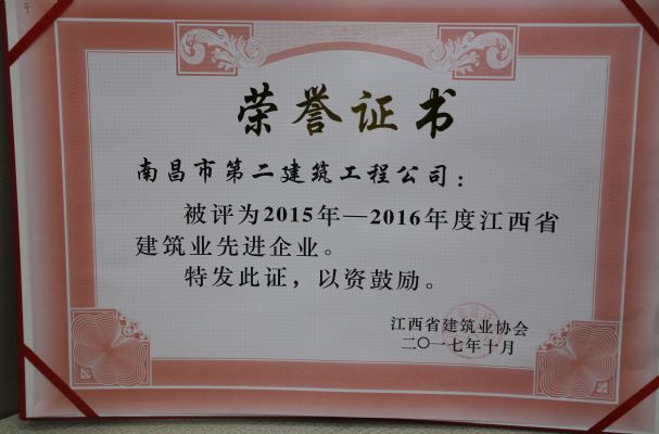 江西省建筑業(yè)協(xié)會對公司頒發(fā)了2015-2016年度江西省建筑業(yè)先進(jìn)企業(yè)榮譽(yù)稱號,對公司建造師何靜、胡建平、高波、章壽榮頒發(fā)了2015-2016年度江西省優(yōu)秀建造師榮譽(yù)稱號。