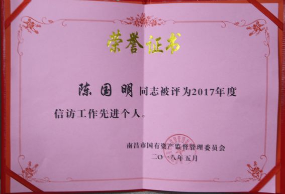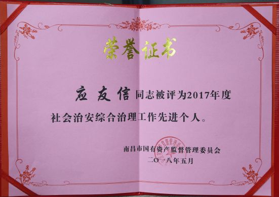 公司社會(huì)治安綜合治理和信訪工作榮獲國(guó)資委2017年度先進(jìn)單位,陳國(guó)明、應(yīng)友信同志榮獲國(guó)資委2017年度先進(jìn)個(gè)人稱號(hào)。